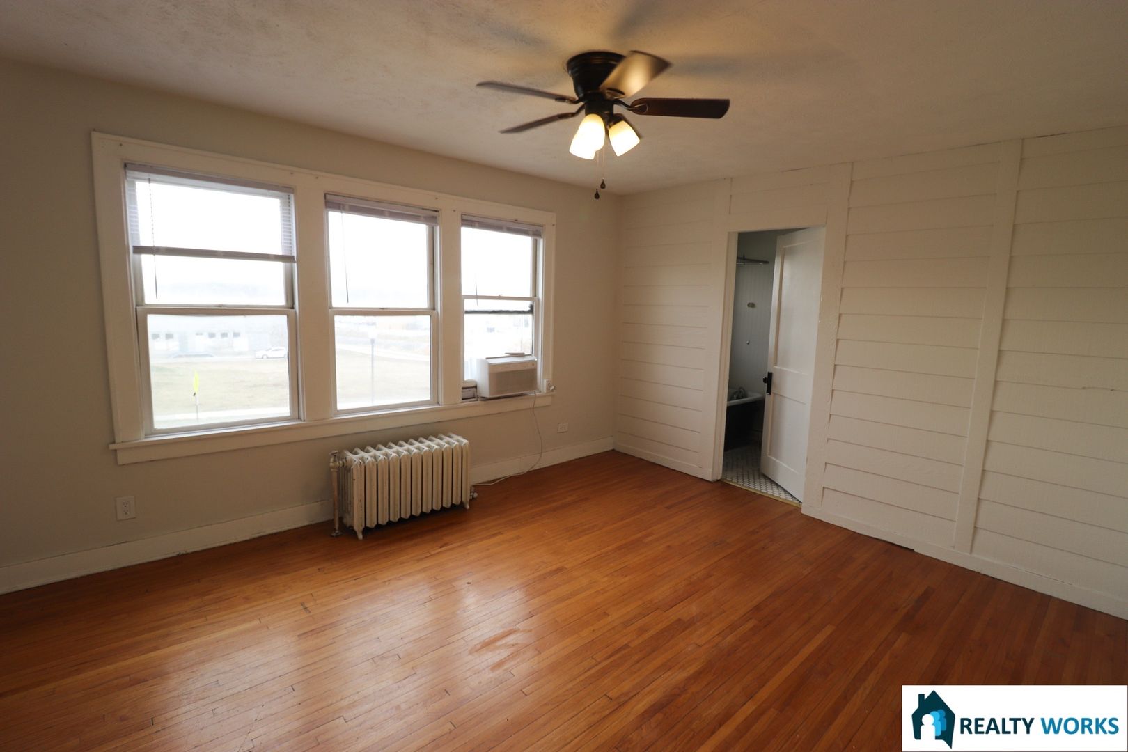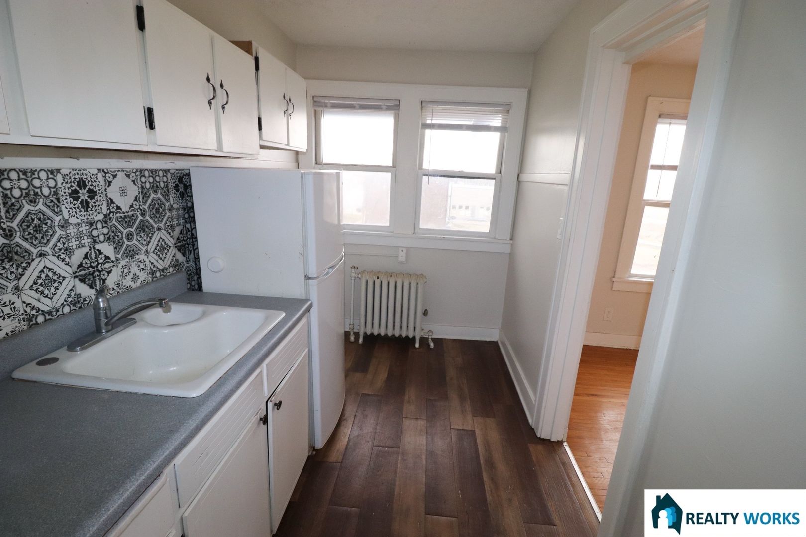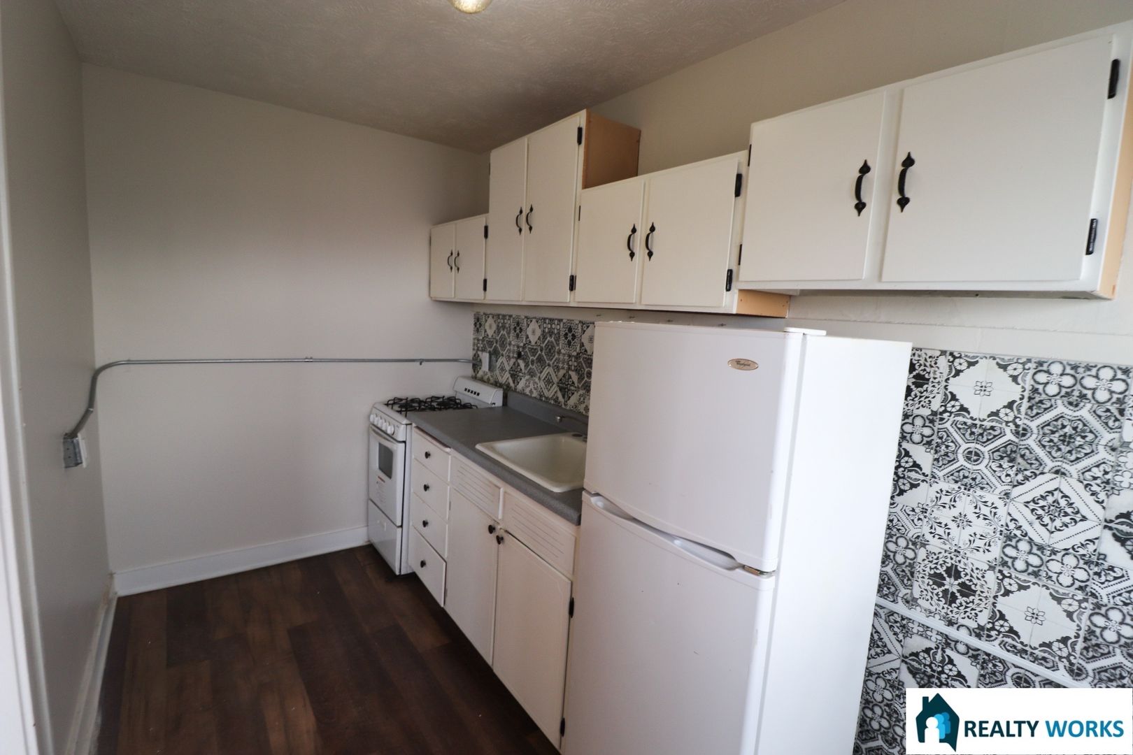 The main living area features hardwood floors and large windows, creating a bright and open feel. The kitchen provides ample cabinet space and a separate layout for added functionality and storage.