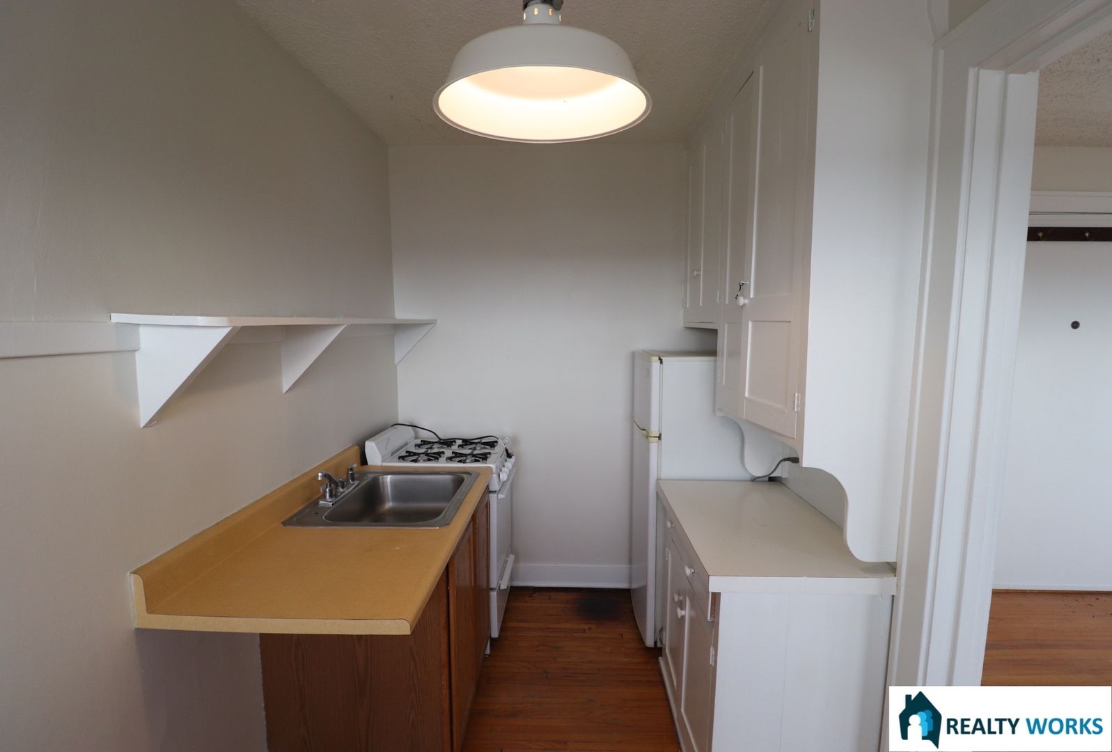 Inside, you'll find hardwood floors and large windows that bring in plenty of natural light. The open layout provides flexibility for arranging your living and sleeping space, while the kitchen offers practical cabinet and counter space for everyday use.